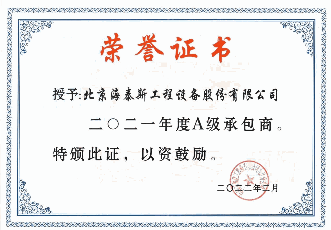 海泰斯為優(yōu)質(zhì)客戶提供的法蘭連接密封完整性管理方案及工程技術(shù)服務, 被授予“二0二一年度A級承包商”榮譽稱號。